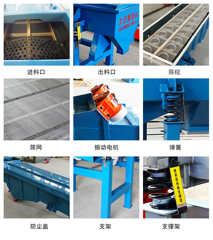 6、设备在停机时产生瞬间的共振区,此时振幅和噪声会明显增大,属正常现象,设备在开停机前,筛面上不得有存留物料,筛网需经常检查是否张紧、破损,如有破损要即时更换。